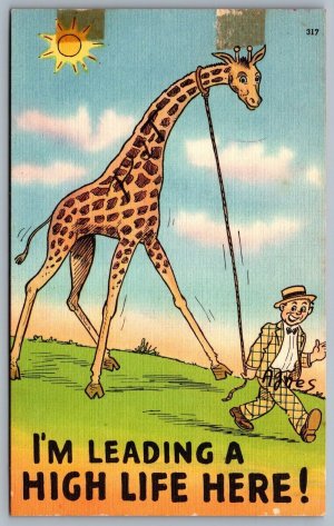 Postcard c1940s I’m Leading A High Life Here Giraffe On a Leash