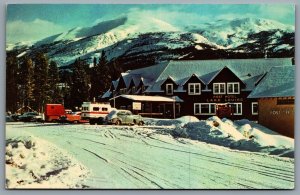 Postcard Lake Louise Alberta c1961 Winter Scene Post Hotel Old Cars Trucks