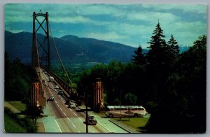 Postcard Vancouver BC c1955 Entrance Lions Gate Bridge Old Greyhound Bus 8c Due