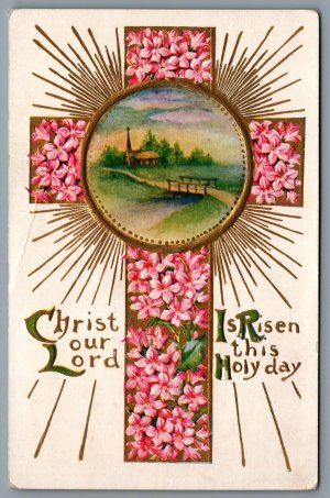 Postcard Easter c1930 Christ Our Lord Is Risen This Holy Day Embossed Flowers