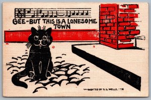 Postcard c1909 Artist Signed R. L. Wells Black Lonesome Cat Musical Notes