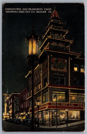 Postcard San Francisco CA c1930 Chinatown Showing Sing Fat Co. Bazar at Night