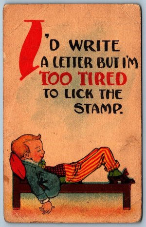 Postcard c1915 I’d Write But I’m Too Tired To Lick The Stamp Lazy Boy Slouching