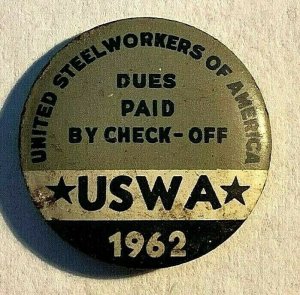 VINTAGE 1962 United Steelworkers of America Dues Paid By Check Off USW - Pinback