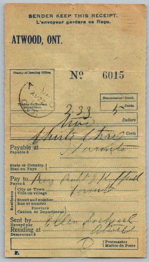 1916 Receipt Atwood Ontario CDS Cancel Payable At Toronto
