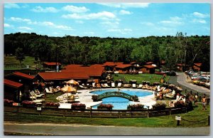 Postcard Minett Ontario c1960s Clevelands House View of Pool and Resort Old Cars