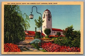 Postcard Boise ID c1935 Union Pacific Depot And Howard Platt Gardens