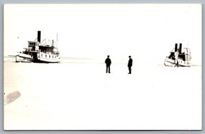 Postcard RPPC Belfast ME March 1907 Steamers Golden Rod & Silver Star Men on Ice