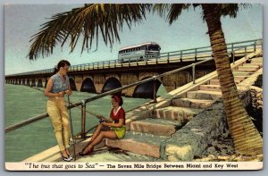 Postcard Seven Mile Bridge FL c1952 The Bus that Goes to Sea Greyhound Bus