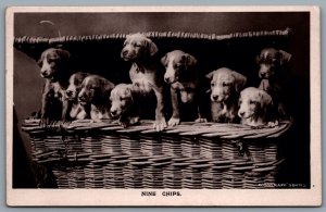 Postcard RPPC c1909 Nine Chips Puppies Dogs In Wicker Bas...