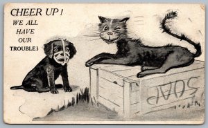 Postcard c1910 Cat Soap Box Puppy Wearing Muzzle Cheer Up! We All Have Troubles