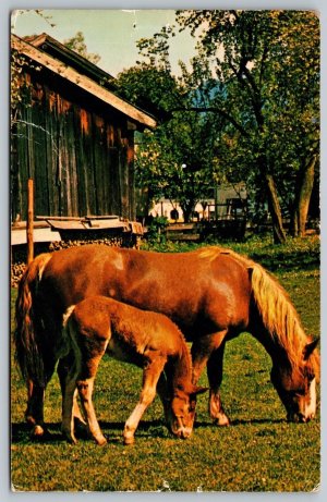 Postcard Horse and Foal Grazing on Grass