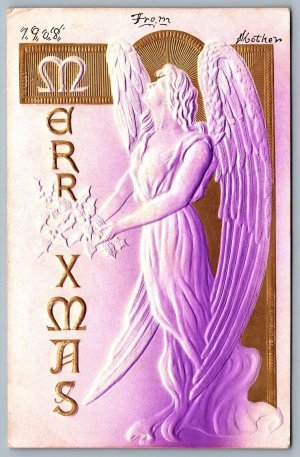 Postcard c1908 Merry XMas Embossed Christmas Angel With W...