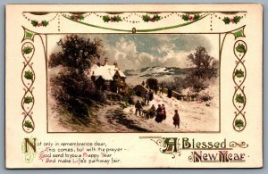 Postcard c1908 A Blessed New Year Floral Border Holly Winter Scene Embossed