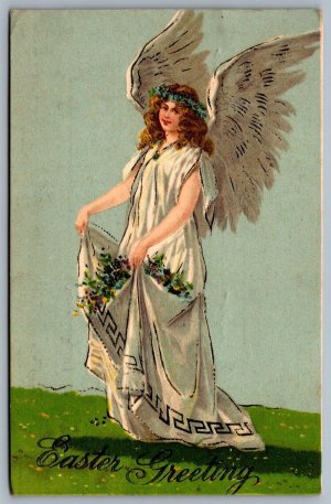 Postcard c1909 Easter Greeting Angel with Wings Collecting Flowers White Gown