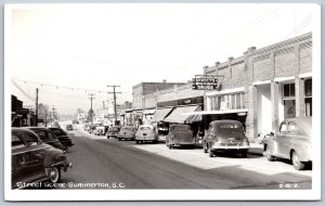 Postcard RPPC c1940s Summerton South Carolina Street Scene Old Cars Shops Signs