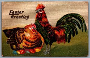 Postcard c1911 Easter Greeting Embossed Colorful Roosters Coloured Eggs Roosting