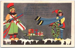Postcard Merry Christmas Art Deco Sled Presents Holly Wreath