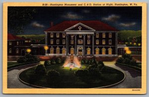 Postcard Huntington WV c1940 Monument & C. & O. Railroad Station Depot at Night